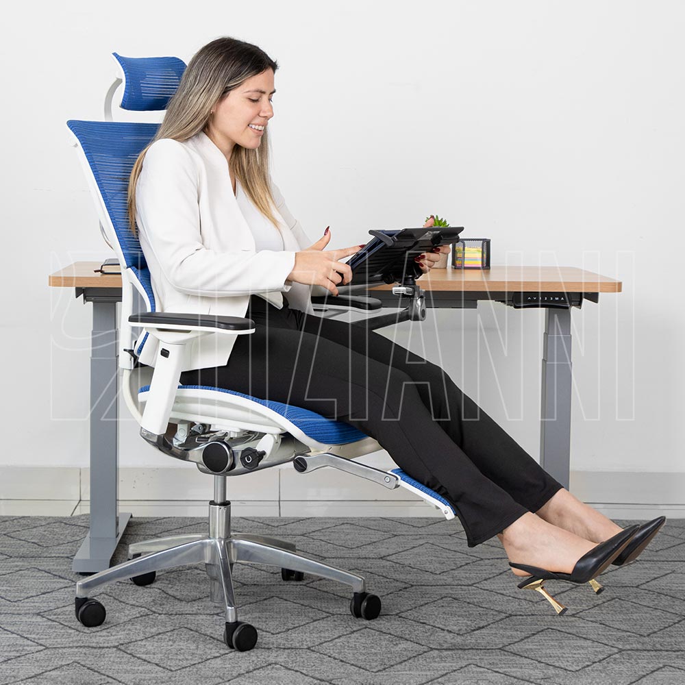 Silla gerencial con soporte de pies y estructura para laptop o tablet.